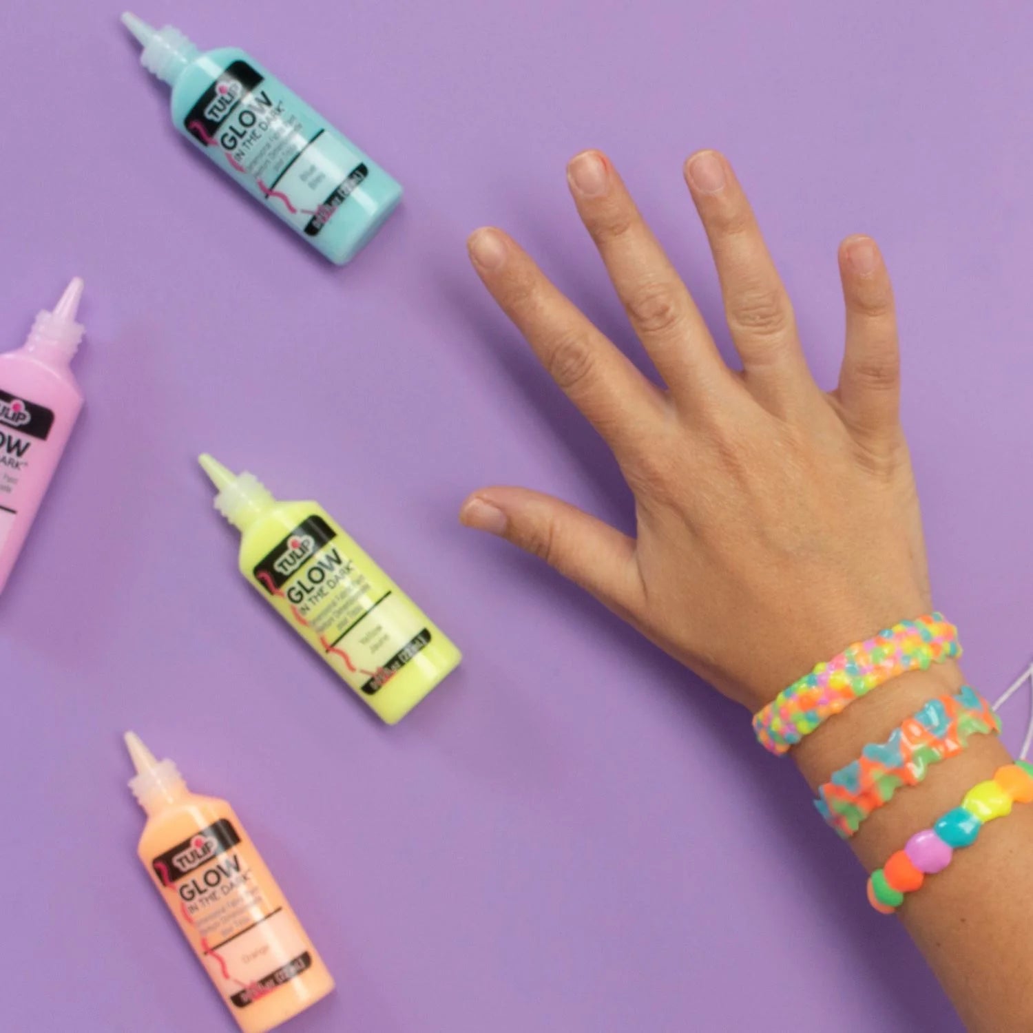 The Tulip Glow in the Dark Puff Paint 10 Pack is stocked with 10 (.75 fl. oz.) nontoxic Puff Paint craft paints in bright glowing colors (2 Natural, Red, Pink, Orange, Yellow, Green, Blue, Purple, Gray). Tulip Puff Paint craft paints dry permanent, flexible and machine washable with fun dimensional texture that stands out on every project!